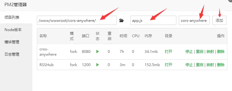 这一步直接点击PM2管理器中的映射就ok了,不得不感慨宝塔的便利。